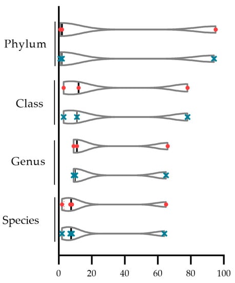 Similarly, the Bray–Curtis distances values, sensitive to the taxa abundances, were calculated to evaluate the diversity between samples, i.e., the beta diversity. Distances matrices and PCoA plots were produced for all taxonomic levels to highlight the clustering of microbiota samples.