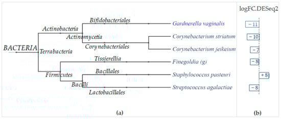 More interesting results were obtained for the samples from the mammary fold. The LimpiAL treatment showed a significant inhibitory action with respect to certain components belonging to the Actinobacteria phylum, i.e., the two species Corynebacterium striatum and Corynebacterium jeikeium, which decreased by 10 and 7 logFC, respectively (Figure 12). A similar inhibitory effect resulted against microbes belonging to the Firmicutes phylum; the Finegoldia genus and the Streptococcus agalactiae were both significantly decreased by 8 logFC (Figure 12). Among the same phylum of Firmicutes, LimpiAL stimulates the growth of Staphylococcus pasteuri, which increased by 8 logFC (Figure 12).