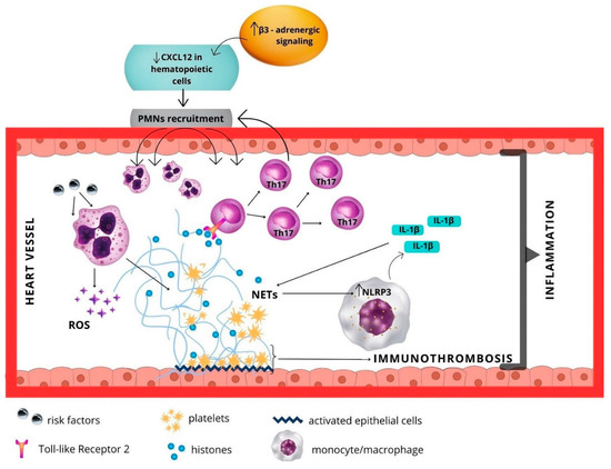 The contribution of PMNs in the pathogenesis of atherosclerotic disease or recovery following myocardial infarction is related to their sterile inflammatory response. Neutrophils activated by various risk factors of vascular diseases, including hyperglycemia, participate in degranulation, phagocytosis, production of reactive oxygen species (ROS), and NET release in the myocardium and peripheral and coronary vessels [63,64]. These cells also play an important role in NET-dependent immunothrombosis by interacting with vascular endothelial cells and platelets [65]. The expression of NETs and persistent inflammation by neutrophils in cardiovascular diseases is driven by other cells participating in the process, resembling a vicious cycle. Activated neutrophils produce significant amounts of ROS, followed by the release of NETs which activate the macrophage NLRP3 inflammasome. This protein complex expresses large quantities of IL-1β, which intensifies the expression of NETs, and in turn, NETs activate the NRLP3 inflammasome in macrophages [66]. Histones included in the NETs interact with TLR2 (Toll-like Receptor-2) on T cells, contributing to the phosphorylation of STAT3 and differentiation of T lymphocytes into Th17, which strongly recruits neutrophils. This ultimately results in prolonged and intensified neutrophil-dependent inflammation [64,67]. The mechanism of immunothrombosis and inflammation mediated by neutrophils in the blood vessel of the heart is presented in Figure 3.