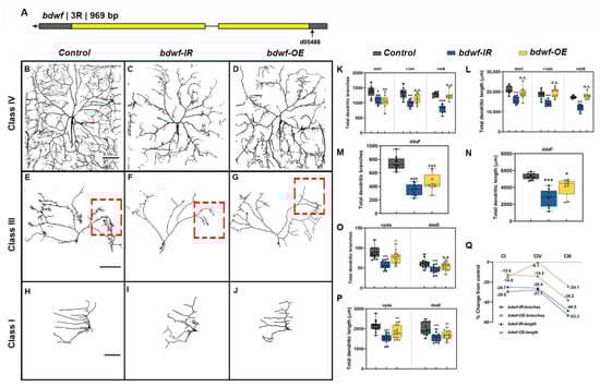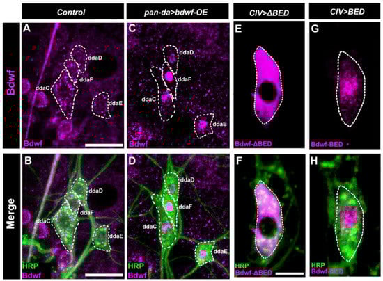 Drosophila stocks were raised on standard cornmeal-molasses-agar media at 25 °C. Fly strains used in these studies were either generated (UAS-bdwf, UAS-bdwf-BED-HA, UAS-bdwf-ΔBED-myc) or obtained from Bloomington or Vienna Drosophila stock centers. bdwfd05488 line was obtained from the Exelixis collection at Harvard Medical School []. The following gene-specific UAS-RNAi (IR) lines were tested: bdwf-IR (JF02831; GD10700); cut-IR (JF03304); RpS24-IR (v104676); RpL4-IR (v101346); RpL22-IR (v104506); RpL31-IR (v104467). GAL4 strains for md neuron subtypes included: GAL4221, UAS-mCD8::GFP (CI-GAL4); ppkGAL4, ppkGAL80, UAS-mCD8::GFP (CIII-GAL4); GAL4477,UAS-mCD8::GFP,/CyO,tubP-GAL80 (CIV-GAL4); GAL4ppk1.9,UAS-mCD8::GFP (CIV-GAL4) GAL421−7,UAS-mCD8::GFP (pan-md-GAL4). Other strains included: UAS-cut; UAS-mCD8::RFP; w, ctc145, FRT19A/y+, ct+, Y []; y,w,tubP-GAL80,hsFLP,FRT19A; GAL4109(2)80,UAS-mCD8::GFP; UAS-RpL10Ab-GFP; UAS-dMetRSL624G-3xmyc []; UAS-Luciferase-IR; UAS-GMA::GFP;GAL4477, UAS-mCherry::Jupiter []; GAL4Act5c; UAS-CD4-tdTomato. Oregon-R was used as a wild-type strain. UP-TORR (https://www.flyrnai.org/up-torr/ (accessed on 1 February 2023)) was used to computationally assess predicted off-target effects for gene-specific RNAi constructs [], and all IR lines used have no predicted off-target effects.