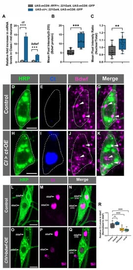 To explore a putative regulatory relationship between Ct and Bdwf, we first tested a hypothesis that Ct may positively regulate bdwf expression. To address this hypothesis, we isolated control CI md neurons and CI neurons in which we ectopically overexpressed Ct and then performed qRT-PCR analyses to measure potential effects on bdwf mRNA expression levels. We observed that expression of a single copy of ct (UAS-ct) in CI neurons led to a four-fold increase in bdwf mRNA levels (Figure 4A). In comparison, ct mRNA expression levels were found to be upregulated by ~14-fold for control CI neurons (Figure 4A). To assess how changes in mRNA levels may translate to protein levels, we ectopically overexpressed Ct in CI neurons and assayed for changes in native Bdwf protein levels via immunostaining. Ectopic Ct expression in CI neurons led to over 110% increase in Bdwf protein expression in these neurons relative to controls (Figure 4B,D–K). In addition, we noted a mild but significant increase in nuclear Bdwf levels when Ct was ectopically expressed, as quantified by the nuclear to whole soma ratio of Bdwf expression (Figure 4C). Expression analyses revealed Bdwf labeling in CI md neurons (Figure 3A and Figure 4D–G). This suggests that, at least in CI neurons, Ct is not required for Bdwf protein expression, given that Ct is not normally expressed at detectable levels in these neurons [,]. To examine whether this holds true for neurons that normally express Ct, we used mosaic analysis with a repressible cell marker (MARCM) to generate ctc145 null mutant CIV neuron clones and stained them for Bdwf. These analyses revealed that ct is not solely required for Bdwf protein expression in Ct-positive CIV neurons (Figure S2A–C). Collectively, these analyses indicate that Cut has a positive effect on the expression of bdwf mRNA and Bdwf protein expression in md neurons.