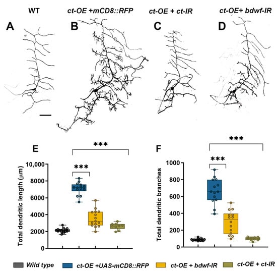 Live imaging was performed as previously described []. Briefly, GAL4477,UAS-mCD8::GFP, GAL4ppk, or GAL4ppk,GAL80ppk,UAS-mCD8::GFP, or GAL4221,UAS-mCD8::GFP female virgins were aged for 2–3 days, crossed to UAS-bdwf-IR or UAS-bdwf-FLAG-HA transgenic males, and reared at 29 °C. Oregon R flies were used as controls. For Bdwf-Ct interaction in CI neurons, UAS-ct; GAL4221,UAS-mCD8::GFP female virgin flies were crossed to either UAS-ct, or UAS-bdwf-IR, or UAS-mCD8::RFP, and Oregon R was used as controls. To analyze Bdwf-Ct interaction in CIV neurons, GAL4477,UAS-mCD8::GFP; ct-IR virgin female flies were crossed to either UAS-CD4-tdTomato (B35837) or UAS-bdwf-IR. GAL4477,UAS-mCD8::GFP virgin female flies that were outcrossed to UAS-CD4-tdTomato were used as controls. Images were acquired from at least 6–10 wandering third-instar larvae. Larvae were placed on a microscope slide, immersed in 1:5 (v/v) diethyl ether to halocarbon oil, and covered with a 22 × 50 mm glass coverslip for live image analyses. Neurons expressing GFP were visualized on either a Nikon C1 Plus confocal microscope or a Zeiss LSM 780. For the Nikon C1 Plus microscope, images were collected as z-stacks using a 20X oil immersion lens at a step size of 2.5 µm and 1024 × 1024 resolution. For LSM 780, images were collected as z-stacks using a 20× dry lens at a step size of 2 µm and 1024 × 1024 resolution. The images were then converted to maximum intensity projections and were processed as previously described using ImageJ [,,]. Quantitative morphometric data such as total dendritic length and the number of branches were extracted and compiled using a custom Python script, and the data output was imported into Microsoft Excel. Morphometric data were analyzed in Microsoft Excel and statistical tests were performed and graphs were plotted using GraphPad Prism 9.