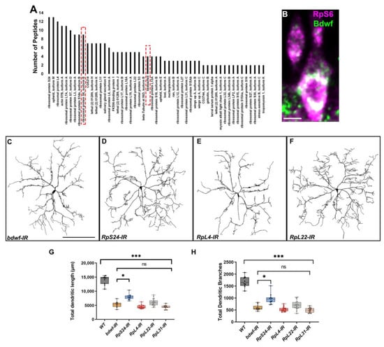Bdwf interacts and colocalizes with ribosomal proteins. (A) Bdwf-interacting proteins identified from MS analysis of affinity-purified Bdwf protein using our rabbit anti-Bdwf polyclonal antibody from homogenized third-instar larvae expressing UAS-bdwf-FLAG-HA protein driven by GAL4Act5C driver. Bdwf and ribosomal protein S6 are marked by a red dashed box. (B) Bdwf co-localizes with the 40 S ribosomal protein S6 to a high degree in md neurons. Knockdown of ribosomal proteins leads to a significant reduction in the TDL (G) and TDB (H) compared to the control. Except for RpS24-IR, knockdown of all the ribosomal proteins phenocopied bdwf knockdown with a high degree of penetrance. Representative images of bdwf-IR, RpS24-IR, RpL4-IR, and RpL22-IR (C–F). Scale bar, 10 µm (B), 200 µm (C–F). (G,H) Quantification of TDL and TDB in CIV ddaC neurons. * p ≤ 0.05, *** p ≤ 0.01, n.s. = not significant. n = 8 for WT, n = 11 for bdwf-IR, n = 13 for RpS24-IR, n = 19 for RpL4-IR, n = 19 for RpL22-IR, n = 15 for RpL31-IR. Genotypes: GAL4477,UAS–mCD8::GFP/+; GAL4ppk1.9, UAS–mCD8::GFP/+, or GAL4477, UAS–-mCD8::GFP/+;GAL4ppk1.9, UAS–mCD8::GFP/UAS–bdwf–IR, or GAL4477,UAS–-mCD8::GFP/UAS–RpS24–IR;GAL4ppk1.9, UAS–mCD8::GFP/+, or GAL4477,UAS–mCD8::GFP/UAS–RpL4–IR;GAL4ppk1.9,UAS–mCD8::GFP/+, GAL4477,UAS–mCD8::GFP/+;GAL4ppk1.9,UAS–mCD8::GFP/UAS–RpL22–IR, or GAL4477,UAS–mCD8::GFP/UAS–RpL31–IR;GAL4ppk1.9,UAS–mCD8::GFP/+.