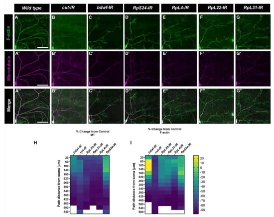 Cell type-specific dendritic architecture is mediated by the organization and dynamics of cytoskeletal fibers [,,,]. In the case of Drosophila md neurons, previous studies have demonstrated that the local distribution and organization of microtubules (MT) and F-actin fibers are sufficient for constraining arbor morphology []. Given that LOF for bdwf and ribosomal protein-encoding genes produced similar defects in dendritic morphogenesis, we next examined how the disruption of these genes may impact the underlying dendritic cytoskeleton. We investigated MT and F-actin cytoskeletal fibers in CIV neurons using multi-fluorescent reporter lines that label F-actin (UAS-GMA::GFP) or MTs (UAS-mCherry::Jupiter) []. The F-actin and MT intensities were then quantified by multichannel digital reconstructions as previously described []. CIV knockdown of bdwf or genes encoding ribosomal proteins severely diminished the MT signal. In the case of bdwf-IR, a percentage change from control analysis revealed that, at 20 µm from the soma, there was ~50% reduction in MT signal, which kept decreasing on dendrites distal to the soma with a nearly complete loss in MT signal at ~400 µm from the soma (Figure 7A’,A’’,C’,C’’,H). Apart from RpS24, knockdown of RpL4, RpL22, and RpL31 ribosomal proteins had a similar effect on MT with nearly 70% reduction in MT signal at 20 µm from the soma, which progressively decreased distal to the soma (Figure 7E’,E’’,F’,F’’,G’,G’’,H). RpS24 knockdown had a milder effect on MT signal, with only ~40% reduction in MT signal at 20 µm from the soma. At the farthest distance from the cell body, 540 µm, the MT signal was reduced by ~77% (Figure 7D’,D’’,H). In contrast to MTs, bdwf-IR led to a redistribution of the F-actin signal. Percent change from control analysis showed that at ~60–160 µm from the soma, F-actin signal increased by more than 20%; however, beyond this distance from soma, the F-actin signal continued to decrease on arbor most distal from the soma (Figure 7A,C,I). Similar to their effect on MTs, the knockdown of RpS24, RpL4, RpL22, and RpL31 ribosomal proteins led to a decrease in the F-actin signal as a function of distance from the soma (Figure 7D–G,I). Previous research from our lab has demonstrated that Ct can regulate effector molecules that target the cytoskeleton, influencing dendritic morphogenesis [,]. Moreover, we have also shown that Ct regulates the expression of ribosomal proteins to modulate dendritic complexity []. Since our study establishes that Cut and Bdwf have a reciprocal relationship, we examined defects associated with cytoskeletal architecture upon ct knockdown in CIV neurons, which revealed severely reduced F-actin labeling throughout the dendritic arbor and progressively diminishing MT signal as a function of distance from the soma (Figure 7B,B’,B’’,H,I). Taken together, our results indicate that ct, bdwf, and genes encoding ribosomal proteins are required to support dendritic cytoskeletal organization and stability.