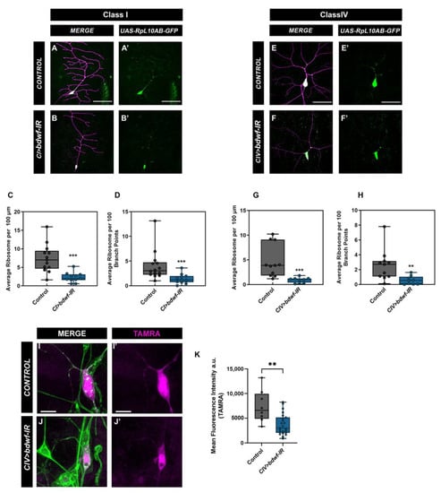 A previous study in C. elegans has shown that disruption of MTs alters ribosome localization in axons []. Our cytoskeletal analyses showed that the knockdown of bdwf severely disrupted MT stability along the dendritic arbor. Therefore, we sought to determine the effect of bdwf-IR on ribosome trafficking along the dendritic arbor. We expressed GFP-tagged RpL10Ab [] under the control of either CI or CIV GAL4 drivers. This GFP-tagged RpL10Ab is reported to be incorporated in both polysomes and monosomes [], so we used it as a proxy to investigate ribosome localization along the dendrites. In both CI and CIV control neurons, ribosome signal is found distributed along the arbor and at dendritic branch points (Figure 8A,A’,E,E’). bdwf knockdown severely impaired ribosome trafficking along the arbor (Figure 8B,B’,F,F’). Quantitative analyses revealed that in both CI and CIV neurons, there was a significant reduction in ribosome density along the dendritic arbor (Figure 8C,G) as well as in the number of branch points with ribosomes (Figure 8D,H) in bdwf-IR compared to control. This suggests that Bdwf is required for ribosomal trafficking on dendritic arbors in these neurons.