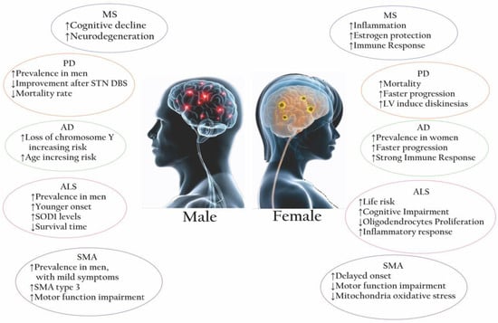 Preclinical and clinical studies reveal significant differences in male and female brains in both physiological and pathological conditions that cannot always be explained by the immunological path. Although sexual dimorphism might be the key to understanding the discrepancies in incidence, outcome, and progression of several NDs [], the impact of sex/gender is still far from being completely elucidated.