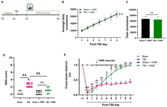 VWR improved sensorimotor coordination and balance in TBI mice. (A) The diagrammatic sketch of experimental design and VWR strategy. (B) There was no significant difference in daily running wheel revolutions between TBI and Sham groups. Two-way ANOVA, post hoc Tukey’s multiple comparisons tests; n = 7. (C) No significant difference was found in total running wheel revolutions between TBI and Sham groups. Unpaired student’s t-test; n = 7. (D) TBI-induced elevation of NSS significantly reduced after seven days of VWR. One-way ANOVA, post hoc Sidak’s multiple comparisons tests; n = 12. (E) TBI caused a significant reduction in beam walking distance increased gradually during VWR. Two-way ANOVA, post hoc Tukey’s multiple comparisons tests; n = 6). *** p < 0.0001, ** p < 0.001, * p < 0.01, vs. Sham. & p < 0.01, && p < 0.001 vs. TBI. ### p < 0.0001, ## p < 0.001, # p < 0.01 vs. Sham + VWR. ns, no significance. VWR, voluntary wheel running; TBI, traumatic brain injury; NSS, neurological severity score.