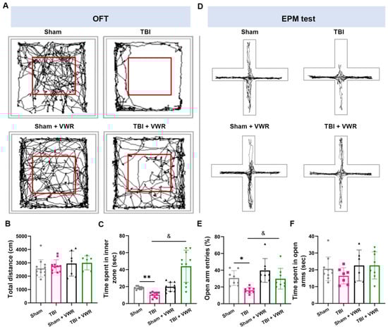 VWR eased the anxiety behavior of TBI mice. (A,D) Representative traces of locomotor activity in the OFT and EPM test. (B) No significant difference in total distance was observed between the four groups in the open field. (C) TBI significantly decreased the time that mice spent in the inner zone of the open field, while VWR significantly reversed it. (E) TBI significantly decreased while the VWR significantly increased the open-arm entries of mice. (F) The total times spent in open arms were similar between the four groups. One-way ANOVA, Post hoc Sidak’s multiple comparisons tests; n = 8. ** p < 0.001, * p < 0.05 vs. Sham, & p < 0.05 vs. TBI. VWR, voluntary wheel running; TBI, traumatic brain injury; OFT, open field test; EPM, elevated plus maze.