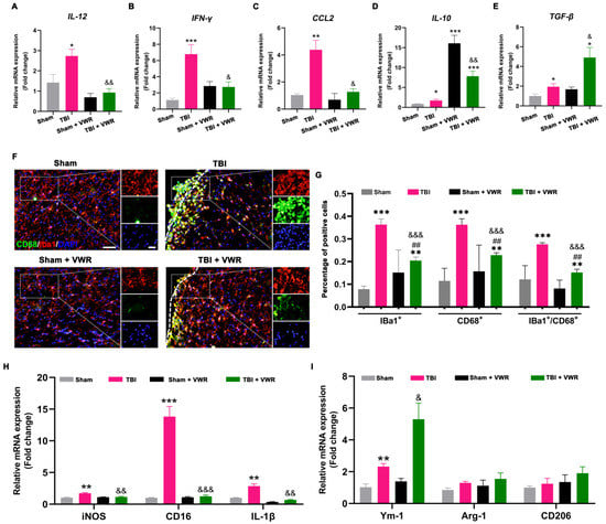 VWR reduced the inflammatory response after TBI. (A–C) The mRNA expression of pro-inflammatory factors in the perilesional cortex, including IL-12, IFN-γ, and CCL2, significantly increased after TBI and decreased after VWR. (D,E) The mRNA expression of anti-inflammatory factors, including IL-10 and TGF-β, increased after TBI and VWR. However, the VWR-induced increase of IL-10 was independent of TBI. (F,G) The activation of microglia in the perilesional cortex was noticed after TBI and significantly reduced after VWR, showed by the percentage of Iba1+, CD68+ and Iba1+/CD68+ cells. (H) The mRNA expression of iNOS, CD16, and IL-1β (M1 microglia markers) in the perilesional cortex significantly increased after TBI and decreased after VWR. (I) The mRNA expression of Ym-1 (M2 microglia markers) significantly increased after TBI and was further enhanced after VWR. While the expression of Arg-1 and CD206 (M2 microglia markers) slightly increased after TBI but significantly up-regulated in TBI + VWR mice. *** p < 0.0001, ** p < 0.001, * p < 0.05 vs. Sham. &&& p < 0.0001, && p < 0.001, & p < 0.05 vs. TBI. ## p < 0.001 vs. Sham + VWR. One-way ANOVA, Post hoc Sidak’s multiple comparisons tests; n = 4. Iba1: red; CD68: green; DAPI: blue; scale bar = 100 µm. VWR, voluntary wheel running; TBI, traumatic brain injury; IL-12, interleukin 12; IFN-γ, interferon γ; CCL2, the C-C motif chemokine ligand 2; IL-10, interleukin 10; TGF-β, transforming growth factor-β; Iba1, Ionized calcium-binding adaptor molecule 1.