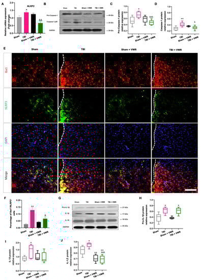VWR reduced the activation of NLRP3 signaling. (A) TBI-induced elevation of NLRP3 mRNA in the perilesional cortex significantly decreased after VWR. (B–D) TBI-induced increase of pro-caspase-1 and caspase-1 proteins in the perilesional cortex significantly decreased after VWR. (E,F) Consistently, the increased expression of NLRP3 (green in E) in activated microglia (red in E) significantly decreased after VWR. (G,H) The protein level of pro-IL-1β increased significantly after TBI. However, it did not affect by VWR. (G,J) The protein level of mature IL-1β increased significantly after TBI and remarkably dropped after VWR. The VWR-induced reduction was independent of injury. (G,I) The protein level of IL-18 was similar to NLRP3 and significantly increased after TBI. ** p < 0.01, * p < 0.05 vs. Sham, &&& p < 0.0001, && p < 0.01, & p < 0.05 vs. TBI. One-way ANOVA, Post hoc Sidak’s multiple comparisons tests; n =5. Iba1: red; NLRP3: green; DAPI: blue; scale bar = 100 µm. VWR, voluntary wheel running; NLRP3, NOD-like receptor thermal protein domain associated protein 3; TBI, traumatic brain injury; Iba1, Ionized calcium-binding adaptor molecule 1; IL-1β, interleukin 1β; IL-18, interleukin 18.