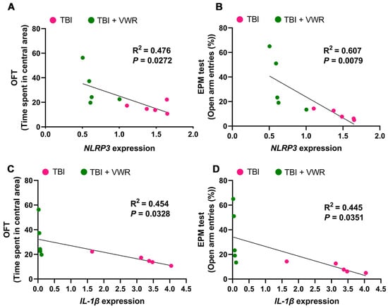 NLRP3 inflammasome activation and its correlation with anxiety behavior were analyzed to further investigate the possible anti-anxiety mechanism of VWR following TBI. Two important inflammatory mediators, NLRP3 and pro-caspase-1, were detected on day nine after TBI. The expression of NLRP3 mRNA (F(3, 32) = 17.17, p < 0.0001; Figure 4A) and pro-caspase-1 (F(3, 28) = 8.266, p = 0.0004; Figure 4B,C) were significantly elevated after TBI and reduced by VWR. This led to the synchronous alteration of the NLRP3 inflammasome (F(3, 28) = 33.28, p < 0.0001; Figure 4E,F)) and mature caspase-1 (F(3, 24) = 6.349, p = 0.0002; Figure 4B,D) in the microglia. Moreover, pro-IL-1β, IL-1β and IL-18 were also detected. The expression of pro-IL-1β was significantly elevated after TBI but was not affected by VWR (F(3, 20) = 10.16, p = 0.0003; Figure 4G,H). However, the expression of mature IL-1β showed a different alteration pattern. It rose significantly after TBI and plummeted remarkably after VWR; the VWR-induced reduction was independent of brain injury (F(3, 20) = 18.34, p < 0.0001; Figure 4G,J). A similar tendency was noted for the alteration in IL-18 with NLRP3 (F(3, 28) = 4.982, p = 0.0068; Figure 4G,I). Further analysis revealed a positive correlation between the reduction of NLRP3/IL-1β mRNA and amelioration in anxiety in the OFT (Figure 5A,C) and EPM tests (Figure 5B,D).