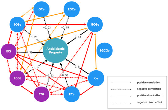 In order to explore the differences in the effects of different monomer units on antioxidant and anti-diabetes activities, we made a comparison (Table 3). It can be seen from the results in Table 3 that the monomer units affecting the two activities can be divided into three categories according to the importance of the effect on the activities. The first category includes ECGt, ECGe, CGt, ECt, and Ce, in which the total effect of ECGe on anti-diabetes activity is 0.88, and the other total effects are above 0.9. The second category includes GCGe, ECe, and GCe. The total effect of these monomers on the two activities ranges from 0.77 to 0.88. The remaining monomers, EGCe and EGCGe, belong to the third category. Their total effect on both activities is less than 0.7, and even the total effect of EGCGe and anti-diabetes activity is only −0.2828. It is obvious that the influence modes of the second- and third-category monomer units on the activity are mainly indirect regulation.