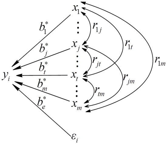 where and is the random error and different are independent of each other. Under the least squares estimation method, the canonical equations to solve the path coefficients can be easily obtained as follows (Equation (2)):