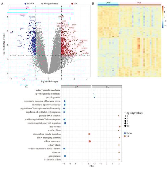Differential expression gene analysis of PAH and control patients. (A) Volcano plots of DEGs, up means the upregulated genes in PAH patients and down means downregulated in PAH patients when compared with normal lung tissue. (B) Heat map of the DEGs expressions of normal and PAH lungs. (C) GO gene set enrichment analysis of the DEGs with p values < 0.01. NES: normalized enrichment score; DEGs: differential expression genes.
