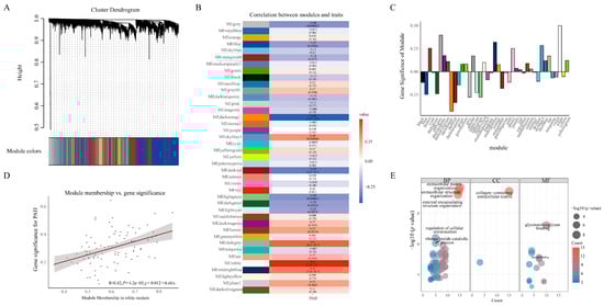 The module detection with WGCNA. (A) Clustering dendrogram plot of PAH and normal lungs. (B) Heat map of the correlation between modules and traits. (C) Gene significance (GS) bar plot of modules. (D) Module membership (MM) and the gene significance (GS) correlation plot. (E) GO enrichment analysis of white module genes. BP: biology pathways; CC: cell component; MF: molecular function.