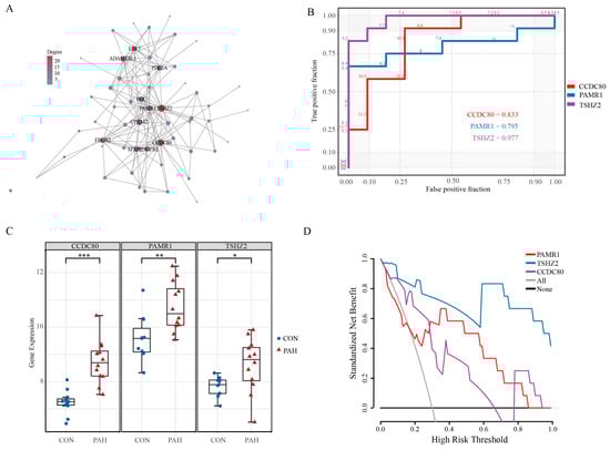 The gene network of the white module was constructed using a topological overlap matrix (TOM) with a threshold = 0.02 (Figure 3A). This network was composed of 90 genes, and each gene was connected with the others. The top genes were CCDC80, PAMR1, and TSHZ2. CCDC80, which was located in the extracellular matrix, enables glycosaminoglycan binding activity and acts upstream of, or within, an extracellular matrix organization. The cell–substrate adhesion is regulated by CCDC80 [19]. It has been reported that CCDC80 may be a novel biomarker and therapeutic target in PAH [20]. TSHZ2 encoded a protein with five C2H2-type zinc fingers, a homeobox DNA-binding domain, and a coiled-coil domain [19]. This gene acts as a transcriptional repressor and plays a role in the development and progression of cancer [21]. Although TSHZ2 and CCDC80 had a powerful discrimination ability (AUCTSHZ2 = 0.977; AUCCCDC80 = 0.833) in GSE53408 (Figure 3B), we did not select these two genes, due to the sequence uncertainty of TSHZ2 and the certainty of the correlation between CCDC80 and PAH. PARM1, which was located in the extracellular region [22], enables calcium ion binding activity and serine-type endopeptidase activity [23,24], and it also had an excellent diagnostic power to distinguish the normal and PAH lungs (AUCPAMR1 = 0.795). CCDC80, TSHZ2, and PARM1 were upregulated in the PAH lungs (Figure 3C). The decision curve analysis graphically shows the clinical usefulness of each gene based on a continuum of potential thresholds (x-axis) and the net benefit of using the genes to risk PAH patients (y-axis). Thus, it was used to facilitate the comparison between the above-mentioned 3 genes. In the analysis, the PAMR1 and TSHZ2 provided a larger net benefit across the range of risk thresholds compared with the CCDC80 (Figure 3D). However, we did not find an increase of PARM1, CCDC80, and TSHZ2 in blood samples of PAH patients, which means these genes were non-secreted factors located in the lungs and induced the progression of PAH.