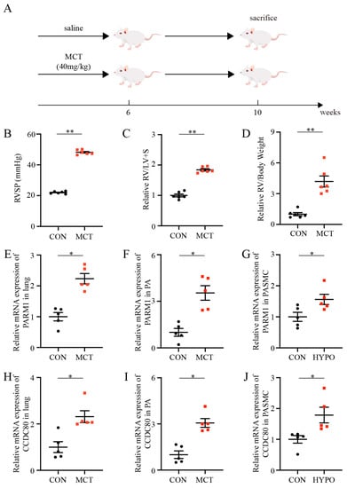 Establishment of pulmonary arterial hypertension rat model and hub gene validation. (A) Schematic illustration of pulmonary arterial hypertension rat model. (B–D) RVSP, RV/(LV + S), and RV/body weight at 4 weeks after MCT injection (n = 6 each). (E–J) Relative mRNA expression of PARM1 and CCDC80 normalized to a β-actin internal control (n = 5 each). Data are shown as mean ± SEM. * p < 0.05, ** p < 0.01 vs. CON group (student’s t-test). CON, control rats without pulmonary arterial hypertension; PAH, pulmonary arterial hypertension; MCT, monocrotaline; RVSP, right ventricle systolic pressure; RV, right ventricle; LV, left ventricle. S, septum.