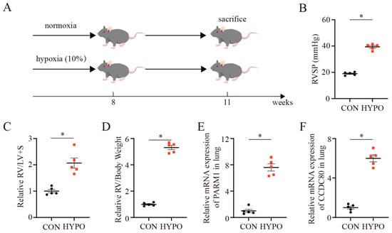 Establishment of pulmonary arterial hypertension mouse model. (A) Schematic illustration of pulmonary arterial hypertension mouse model. (B–D) RVSP, RV/(LV + S), and RV/body weight at 3 weeks after chronic hypoxia exposure (n = 5 each). (E,F) Relative mRNA expression of PARM1 and CCDC80 normalized to a β-actin internal control (n = 5 each). Data are shown as mean ± SEM. * p < 0.05 vs. CON group (student’s t-test). CON, control mice without pulmonary arterial hypertension; HYPO, hypoxia; RVSP, right ventricle systolic pressure; RV, right ventricle; LV, left ventricle. S, septum.