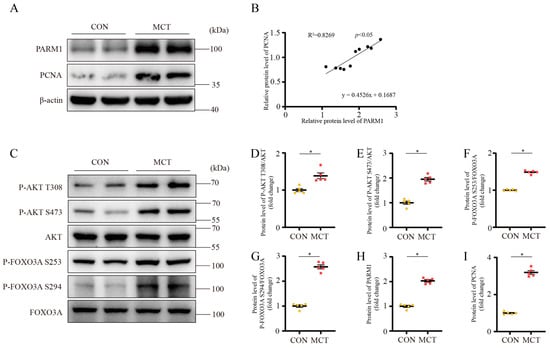 Screening of a novel therapeutic target for the PAH rat model. (A,H,I) Representative Western blots and analysis of PARM1 and PCNA expression in rat lung. Equal protein loading was confirmed using an anti-β-actin antibody (n = 5 each). (B) Linear regression analysis of the association between PARM1 and PCNA expression in rat lung. (C–G) Representative Western blots and analysis of p-AKT(T308)/AKT ratio; p-AKT(S473)/AKT ratio; p-FOXO3A(S253)/FOXO3A ratio; p-FOXO3A(S294)/FOXO3A ratio in rat lung. Data are shown as mean ± SEM (n = 5 each); * p < 0.05 vs. CON group (student’s t-test).