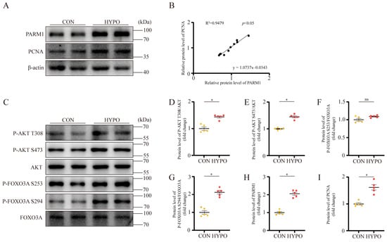 Validation of the screened hub gene in hypoxia-induced PAH mouse model. (A,H,I) Representative Western blots and analysis of PARM1 and PCNA expression in mouse lung. Equal protein loading was confirmed using an anti-β-actin antibody (n = 5 each). (B) Linear regression analysis of the association between PARM1 and PCNA expression in mouse lung. (C–G) Representative Western blots and analysis of p-AKT(T308)/AKT ratio; p-AKT(S473)/AKT ratio; p-FOXO3A(S253)/FOXO3A ratio; p-FOXO3A(S294)/FOXO3A ratio in mouse lung. Data are shown as mean ± SEM (n = 5 each); * p < 0.05 vs. CON group; ns represents “not significant” (student’s t-test).