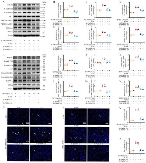 To further confirmed our hypothesis, we implemented in vitro cell culture studies. Western blot analysis showed that PDGF/hypoxia could promote the expression of PARM1 in primary isolated rat PASMC (Figure 8A,B,H,I), which was consistent with our ex vivo findings. Moreover, increased phosphorylation of AKT and FOXO3A was detected during the PDGF-BB/hypoxia treatments (Figure 8A,C–F,H,J–M). Simultaneously, the level of PCNA was significantly upregulated in PASMCs treated with PDGF/hypoxia (Figure 8A,G,H,N). As anticipated, these effects induced by PDGF-BB/hypoxia were weakened by two independent siRNA for PARM1; namely, si-PARM1-01 and si-PARM1-02 (Figure 8A–N and Figure S5). To determine the exact biological role of PARM1, the effect of PARM1 silencing on the proliferation of PDGF/hypoxia-exposed PASMCs was explored. EdU assays indicated that the proliferation rates of PDGF/hypoxia-treated PASMCs were increased compared to that of the controls and were dramatically attenuated by PARM1 downregulation (Figure 8O–R).