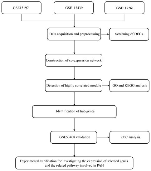 The workflow is illustrated in Figure 10. The gene Expression Omnibus (GEO) datasets were explored, and four datasets (Table 1) were selected to screen the potential markers of PAH. We combined the three microarray datasets of GSE15197, GSE113439, and GSE117261 with combat packages, and obtained 148 samples (99 PAH samples and 49 Controls), each containing 17,664 genes [59,60,61]. This task was completed by the “ComBat” tool from the R-package “sva”. GSE53408 was utilized as a validation set to verify the identified candidate genes [62]. All data were analyzed and visualized using R Software 4.1.0.