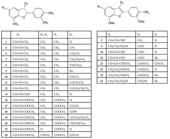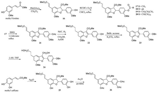 Oxidative coupling of methyl ferulate with IDA generated benzofuran compound 16 (Scheme 2). Compound 16 was further acylated to obtain compounds 17–20. Dehydrogenation of compound 17 using DDQ in 1,4-dioxane under reflux afforded compound 21. Compound 21 was dissolved in the mixture solvent of CH3OH and AcOH with 10% Pd/C as catalysis under a hydrogen atmosphere to yield compound 22 through both hydrogenation and hydrolysis reactions. Benylation of compound 22 using benzyl bromide and K2CO3 in acetone under reflux afforded compound 23 in a high yield of 85%. By using LAH in dry THF, two methyl carboxylates were reduced to hydroxymethyl to form compound 24. We also used Ag2O for the oxidative coupling of methyl caffeate to form compound 25, which was then acetylated to form compound 26.