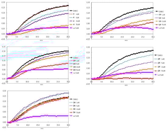 In this study, the depolymerization activity of compounds 4, 19, 20, 25, and 26 on pure MAP-rich tubulins were assessed in vitro. As shown in Figure 2, compounds 4, 19, 20, and 25 demonstrated a concentration-dependent inhibition of tubulin polymerization, while compound 26 did not affect the microtubule assembly.