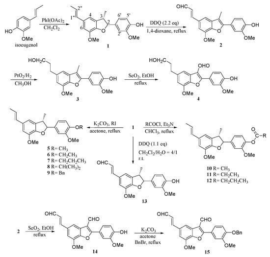 Previously, we reported a synthetic route of salvinal using isoeugenol as a starting material, as reacted with iodobenzene diacetateuse (IDA) in a four-step reaction with a yield of 23% [13]. The convenient synthesis method shortens the preparation procedure of salvinal and benzofuranlignan derivatives. The synthesis steps of salvinal derivatives are shown in Scheme 1. Isoeugenol as a starting material was reacted with iodobenzene diacetateuse (IDA) to obtain salvinal (4) in a four-step reaction (Scheme 1). Various substitutions in the C-3 and C-5 positions of the benzofuran skeleton were synthesized and evaluated for their impact on anticancer activity. In order to examine the influence of phenyl substituent at the C-2 position of compound 1, we used compound 1 as the template for further alkylation (that resulted in compounds 5–9) and acylation reactions (that resulted in compounds 10–12). Compound 1 was treated with DDQ (1.1 eqa) in the mixture solvent of CH2Cl2/H2O=4/1 to initiate a reaction, which could selectively oxidize arylpropene to arylpropenal, forming compound 13 under the room temperature. Compound 2 was further oxidized with SeO2 in refluxing EtOH to yield compound 14. The structural difference between compound 14 and salvinal (4) is the side chain at the C-5 position, and the anticancer activities of the two are only slightly different. To evaluate the impact of phenyl substituent at the C-2 position, alkylation reaction was conducted with compound 14 in order to obtain compound 15, as shown in Scheme 1.
