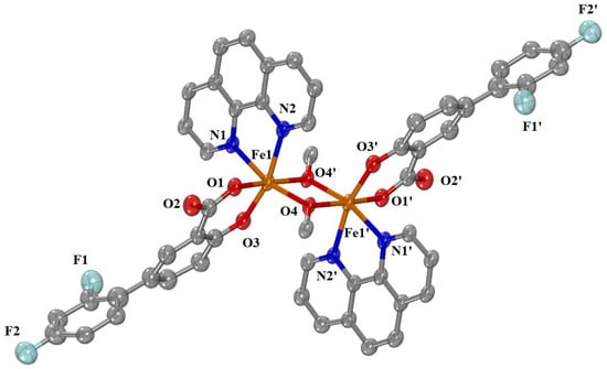 Molecular structure of complex 1. Aromatic and methyl hydrogen atoms and water solvate molecules are omitted for clarity. Symmetry: (′) −x + 1, −y + 1, −z + 1. (Atom color code: C in grey; O in red; N in blue; Fe in orange; F in light blue-green).