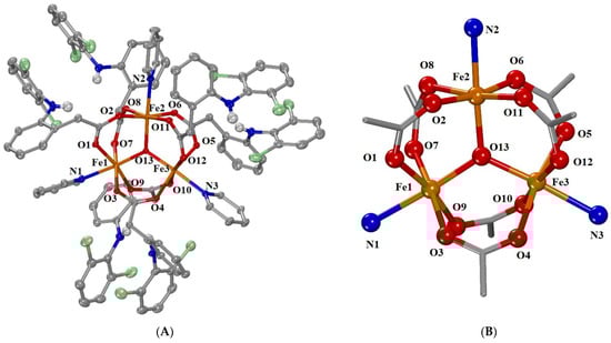 (A) Molecular structure of the cationic complex [Fe3O(μ2-dicl-O,O′)6(py)3]+. Aromatic hydrogen atoms, counter anions, and solvate molecules are omitted for clarity. (B) The core structure of complex [Fe3O(μ2-dicl-O,O′)6(py)3]+. (Atom color code: C in grey; H in white; O in red’ N in blue; Fe in orange; Cl in light green).