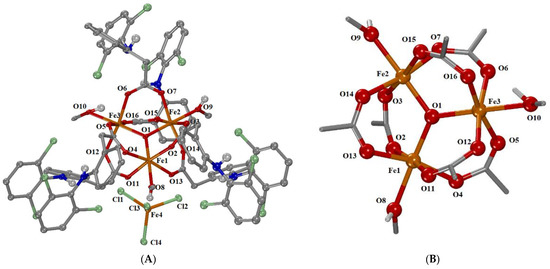 (A) The molecular structure of complex [Fe3O(μ2-dicl-O,O′)6(ΜeOH)3][FeCl4]. Aromatic and methyl hydrogen atoms as well as diclofenac acid and methanol and water solvate molecules are omitted for clarity. (B) The core structure of the cationic complex [Fe3O(μ2-dicl-O,O′)6(MeOH)3]+. (Atom color code: C in grey; H in white; O in red; N in blue; Fe in orange; Cl in light green).