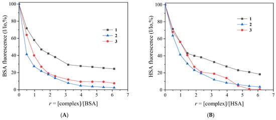 (A) Plot of % relative BSA fluorescence emission intensity (I/Io, %) at λem,max = 343 nm versus r (= [complex]/[BSA]) for complexes 1–3 (up to 24.4% of the initial BSA fluorescence for 1, 7.5% for 2, and 2.4% for 3). (B) Plot of % relative HSA fluorescence emission intensity (I/Io %) at λem,max = 351 nm versus r (=[complex]/[HSA]) for complexes 1–3 (up to 18.3% of the initial HSA fluorescence for 1, 0.6% for 2, and 3.5% for 3).