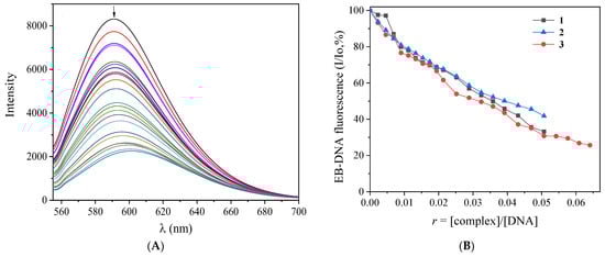 Ethidium bromide is a known fluorescent compound which intercalates into DNA bases. The competition of a compound with EB is a usual means to confirm the DNA-binding mode. The solutions of NSAIDs and their complexes do not fluoresce either alone or in the presence of the CT DNA or EB solution at room temperature when excited at 540 nm. Therefore, the changes occurring in the fluorescence emission spectra of an EB–DNA solution upon addition of the compounds may be used to study the EB-displacing ability of the compounds from the EB–DNA adduct []. The EB–DNA adduct was prepared after a 1-h pretreatment of a solution containing EB ([EB] = 20 μM) and CT DNA ([DNA] = 26 μM). The fluorescence emission spectra of this solution were recorded in the presence of increasing amounts of complexes 1–3 (shown for complex 3 in Figure 9A). The addition of the complexes resulted in a quenching of the EB–DNA emission band at 592 nm (up to ~74% of the initial EB–DNA fluorescence (Figure 9B and Table 9). Such quenching probably originated from the displacement of EB by the compounds, revealing their competition with complexes for the DNA intercalation sites [].