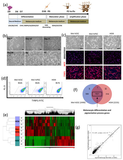To reproduce the development of the melanocyte chronobiology, we have established a multistep protocol in which human-induced pluripotent stem cells (hiPSCs) and human embryonic stem cells (hESCs) are differentiated into melanocyte precursors by the induction of the neural crest lineage followed by a maturation step (Figure 1a). First, hPSCs were aggregated in embryoid bodies (EBs). The induction of hPSCs within the neural crest lineage was initiated by the use of dual-SMAD inhibition in combination with Wnt signaling [11,12]. At day 4, and to initiate the differentiation into melanocytes, small molecules including endothelin-3 (EDN3), stem cell factor (SCF), bone morphogenetic 4 (BMP4), and ascorbic acid (AA) were added at specific concentrations [7]. At day 7, EBs were placed on gelatin and grown in the melanocyte medium (MGM-4) supplemented by the same molecules. In these conditions, cells migrated out of the EBs. From day 21 to day 30, cells acquired a melanocyte-like dendritic cell morphology. The induction of melanocyte maturation was performed at day 30. For this purpose, cells were first dissociated with trypsin and plated in MGM-4 supplemented with EDN3, SCF, and forskolin (FSK), essential for the survival and maturation of melanocytes. After two passages, melanocytes with a typical mature morphology were observed (Figure 1a,b). FSK was added to the medium in addition to the EDN3 and SCF to induce the maturation from the cell dissociation at day 30 corresponding to passage 0 (P0) up to passage 2 (P2). Then, the melanocyte population (Mel-hPSC) was maintained in MGM-4 medium along the amplification phase and exhibited a typical morphology of human melanocytes (Figure 1c). As a positive control, human epithelial melanocytes (HEMs) were used for further characterization. Analysis by immunofluorescence staining for melanocytic markers indicated that most of the Mel-hiPSC and Mel-hESC expressed MITF (microphthalmia-associated transcription factor), which is considered the main transcription factor of melanogenesis as well as its targets, such as TYRP1 (tyrosinase-related protein 1) (Figure 1c). This result was confirmed by flow cytometry analysis revealing that more than 99% of cells were positive for TYRP1 expression (Figure 1d). A transcriptomic analysis was performed to analyze the gene expression profile of Mel-hESC in comparison with HEMs. Hierarchical clustering showed similar gene expression profiling between Mel-hESC and HEMs compared to hESCs (Figure 1e). Almost 70% of genes upregulated in comparison to hESCs were found to be common between Mel-hESC and HEMs (Figure 1f). Gene ontology analysis of these common genes revealed a close genetic signature with biological processes related to “melanocyte differentiation” and the “pigmentation process” (Figure 1f and Figure S1(i)). Moreover, the gene expression levels were highly correlated between patient iMels and HEMs (R = 0.97) (Figure 1g). These results demonstrated the generation of a pure population of melanocytes.