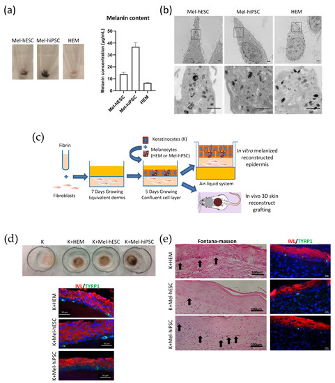 - Jones, J.C.; Sabatini, K.; Liao, X.; Tran, H.T.; Lynch, C.L.; Morey, R.E.; Glenn-Pratola, V.; Boscolo, F.S.; Yang, Q.; Parast, M.M.; et al. Melanocytes derived from transgene-free human induced pluripotent stem cells. J. Investig. Dermatol. 2013, 133, 2104–2108. [Google Scholar] [CrossRef]