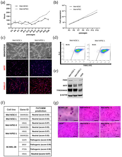 Next, we investigated the proliferative potential of Mel-hPSC by measuring the doubling time at early (from passage 3 to passage 15) and late passages (>passage 15) (Figure 3a). At early passages, both Mel-hESC and Mel-hiPSC maintained a stable doubling time between 50 and 80 h. At later passages, an increased doubling time over 100 h was observed. At passage 26, the doubling time reached 200 h and 120 h for Mel-hiPSC and Mel-hESC, respectively (Figure 3a). By determining the cumulative cell expansion for Mel-hPSC until P15, our results demonstrated the possibility of generating a large-scale bank of approximately 1014 cells (Figure 3b). Furthermore, we showed that over time in culture, Mel-hPSC maintained their dendritic morphology (Figure 3c) and expressed all the melanocytic markers, as shown by immunostaining (Figure 3c), flow cytometry (Figure 3d) and immunoblot analysis (Figure 3e). We next evaluated the genomic integrity of Mel-hPSC maintained for a long period in culture. The karyotyping of Mel-hPSC at late passages showed no chromosomal abnormalities (Figure S3). We also sought to analyze the appearance of mutations of 50 oncogenic and tumor suppressor genes using the AmpliSeq Cancer Hotspot Library v2 (Thermo Fisher Scientific: Waltham, MA, USA) in Mel-hPSC at early and late passages. We used one melanoma cell line (SK-MEL-28 from ATCC) carrying the pathogenic mutations in EGFR, BRAF, and PTEN (https://maayanlab.cloud/SK-MEL-28, accessed on 10 January 2023) as a positive control. The presence of single nucleotide polymorphisms (SNP) was also analyzed in Mel-hPSC, revealing the appearance of neutral mutations as referred to by the database FATHMM (http://fathmm.biocompute.org.uk, accessed on accessed on 6 March 2017). Altogether, these results indicated the absence of a genomic tumor in the Mel-hPSC at late passages. To complete this genomic analysis, a soft agar colony formation was assessed on Mel-hPSC at early and late passages to evaluate their potential malignant transformation. While large aggregates were observed with the SKMEL28 melanoma cell line, no aggregate was detected with Mel-hPSC and HEMs. These results showed that over time in culture, the Mel-hPSC is not transformed (Figure 3g).