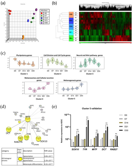 Transcriptional analysis of Mel-hESC during the differentiation process in a time-dependent manner. (a) Principal components analysis (PCA) of each differentiation time point (day 0: D0, day 7: D7, day 14: D14, day 21: D21, and day 30: D30). (b) Hierarchical clustering of gene expression at D0, D7, D14, D21, and D30 (n = 3). (c) Graphics of 5 clusters. Clustering of genes statistically differentially expressed during differentiation and regrouped with the same expression profile. (d) (Upper) Gene network linked to MITF. The 328 genes contained in cluster 5 are analyzed in STRINGdb (with medium confidence 0.4). The global network obtained is sent to Cytoscape to identify a gene sub-network directly linked to MITF. A score is attributed to edges in terms of connectivity with MITF [13]. The size of gene circles is correlated with these scores. Genes circles colored in yellow are members of the “developmental pigmentation” gene ontology biological process term. (Lower) Top gene ontology biological process terms from enrichment analysis of the global STRINGdb network. Quantitative PCR of SOX10, MITF, DCT, TYR, and RAB27A during hESC differentiation from D0 to D30. The data are normalized to 18S and expressed as relative expressions of undifferentiated hESCs at D0. (e) Cluster 5 validation. Quantitative PCR of SOX10, TYR, MITF, DCT and RAB27 for Mel-hESC from D0 to D30. The data are normalized to 18S and expressed as relative expressions of D0. ** p < 0.01.