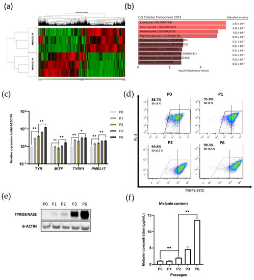 We next sought to determine the molecular pathways that drive melanocyte differentiation by using next-genome sequencing (NGS) technology and differential expression of genes (DEG) analysis. The expression pattern of the whole genome was analyzed in a time-dependent manner at day 0, day 7, day 14, day 21, and day 30 of the differentiation process. Principal component analysis (PCA) showed a similar transcriptional profile between replicates of each time point, demonstrating the robustness of the protocol (Figure 4a). This observation was supported by the hierarchical clustering overview of the transcriptomic analysis (Figure 4b). To decipher the molecular and cellular pathways involved in each stage of the developmental process, we performed a kinetic analysis on differentially expressed genes for every comparison (respectively, day 0 versus day 32, day 7 versus day 32, day 14 versus day 32, and day 21 versus day 32). Genes were regrouped in eight clusters according to the kinetics of their differential expression (Table 1). Five clusters have been analyzed by gene ontology using the ENRICH’R interface (Figure S4). These five clusters are shown in Figure 4c. Cluster 1 included genes primarily related to the pluripotency, morphogenesis, and development of epithelial tissues. Cluster 1 was gradually repressed from day 0 to day 30. In the second cluster, the expression of genes associated with cell division and the regulation of the cell cycle increased from day 0 to day 7 and then decreased as the cells migrated out of the EBs. Cluster 3 is composed of several genes involved in the Wnt signaling pathway and in the negative regulation of embryonic development and neurogenesis. Their expression gradually increased from day 0 to a peak on day 14. The molecular signaling pathway involved in melanogenesis is grouped into two clusters (4 and 5) and included 338 genes. These genes showed a differential expression between day 21 and day 30. Functional enrichment analysis on cluster 5 revealed 19 genes directly connected to MITF, the master regulator of melanogenesis, among which 6 genes including SOX10, DCT, TYR, and RAB27 (yellow circles in Figure 4d) are defined as being involved in “developmental pigmentation” (Figure 4d). To confirm our data, the expression profiles of these markers were validated by quantitative real-time PCR (Figure 4e). While all of this molecular characterization was performed during the differentiation processes, we next sought to molecularly define the maturation step. We thus compared gene expression profiles between P0 and P4, which are immature and mature Mel-hESC, respectively. These transcriptomic analyses showed a differential gene expression pattern at P4 when compared to P0 (Figure 5a). Many differentially expressed genes (DEGs) were identified (p-value adjusted ≤ 0.5; fold change ≥ 1.5; minReads100) with 1309 upregulated and 1719 downregulated DEGs. Gene ontology analysis of the upregulated DEGs revealed biological processes associated with “lytic vacuole”, “lysosome”, and “melanosome” (Figure 5b). Gene expression analysis for MITF and its downstream target genes (TYPR1, TYR, and PMEL17) in immature Mel-hESC at P0 to the mature P6 stage revealed an increase in melanogenesis genes (Figure 5c). Flow cytometry analysis also showed an increase in the level of TYRP1 expression with the passages of Mel-hESC (Figure 5d). Similarly, Western blot analysis indicated that the major tyrosinase enzyme involved in melanin synthesis was not expressed at passage 0 and became progressively expressed after several passages (Figure 5e). Accordingly, a progressive increase in melanin synthesis was observed from passage 2 to 6 (Figure 5f). Thus, our data indicated the acquisition of a mature phenotype of Mel-hESC with the passages.