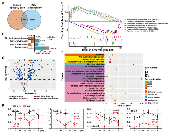 Analysis of mouse epileptic genes. (A) Venn diagram of 315 epilepsy-related genes in the ventral hippocampus of mouse temporal lobe epilepsy (TLE). (B) Classification of 315 possible mouse epilepsy-related genes into 251 arrhythmic genes, 25 loss-of-rhythmicity genes, 34 gain-of-rhythmicity genes, and five rhythmicity-maintaining genes. Shown are percentages of significantly differentially expressed genes between TLE and CTL groups (blue) and not significantly differentially expressed genes (orange). (C) Volcano plot of up-regulated and down-regulated genes in arrhythmicity, loss-of-rhythmicity, gain-of-rhythmicity, and rhythmicity-maintaining groups at the seizure peak time (ZT7) of mouse TLE. (D) Gene set enrichment analysis (GSEA) of significantly altered KEGG pathways in 315 epilepsy-related genes at ZT7. The rank of the gene set of each pathway is listed on the right side of the plot. Four pathways show positive enrichment scores, and three show negative enrichment scores. (E) Top 20 KEGG enrichment pathways of 79 mouse epilepsy driver genes. Circles represent the gene numbers in specific pathways and colored intensities the corrected p values. The first-level categories of KEGG pathways are marked in different colors. (F) Expression of representative arrhythmic genes involved in the circadian entrainment and glutamatergic synapse pathways simultaneously, including Grin2a (Glutamate ionotropic receptor NMDA type subunit 2A), Gria2 (Glutamate ionotropic receptor AMPA type subunit 2), Kcnj3 (Potassium inwardly rectifying channel subfamily J member 3), and Grin1 (Glutamate ionotropic receptor NMDA type subunit 1). The black curve represents gene expression values from the CTL mice, and the red curve is for those in TLE mice.