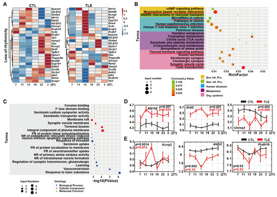 Analysis of 25 loss-of-rhythmicity genes. (A) Heatmaps of 25 loss-of-rhythmicity genes in CTL (left) and TLE (right) mice. (B) Top 20 KEGG enrichment pathways of loss-of-rhythmicity genes in TLE mice. Circles represent the gene numbers in specific pathways and colored intensities the corrected p values. The first-level categories of KEGG pathways are marked in different colors. The same pathways that also turn up in KEGG analysis of gain-of-rhythmicity genes are underlined. (C) Top 20 GO enrichment terms of loss-of-rhythmicity genes. NR: negative regulation, PR: positive regulation. (D) Expression of three representative loss-of-rhythmicity genes Htr1d (5-hydroxytryptamine receptor 1D), Drd2 (dopamine receptor D2), and Chrna3 (cholinergic receptor nicotinic alpha 3 subunit) involved in the neuroactive ligand-receptor interaction pathway. (E) Expression of three driver genes in the loss-of-rhythmicity group, including Kcnq2 (Potassium voltage-gated channel subfamily Q member 2), Pcdh19 (Protocadherin 19), and Aldh2 (Aldehyde dehydrogenase 2 family member). p value of meta2d of each gene was calculated with MetaCycle. The black curve represents gene expression values from the CTL mice, and the red curve is for those in TLE mice.