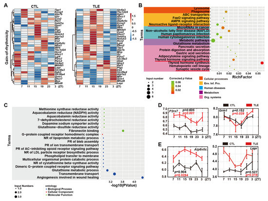 Analysis of 34 gain-of-rhythmicity genes. (A) Heatmaps of 34 gain-of-rhythmicity genes in CTL (left) and TLE (right) mice. (B) Top 20 KEGG enrichment pathways of gain-of-rhythmicity genes in TLE mice. The same pathways that also occur in KEGG analysis of loss-of-rhythmicity genes are underlined. (C) Top 20 GO enrichment terms of gain-of-rhythmicity genes. (D) Expression of two representative gain-of-rhythmicity genes P2rx7 (purinergic receptor P2X 7) and Grm1 (glutamate metabotropic receptor 1) involved in the neuroactive ligand-receptor interaction pathway. (E) Expression of two driver genes in the gain-of-rhythmicity group, including Atp6v0c (ATPase H+ transporting V0 subunit c) and Lepr (leptin receptor). The black curve represents gene expression values from the CTL mice, and the red curve is for those in TLE mice.