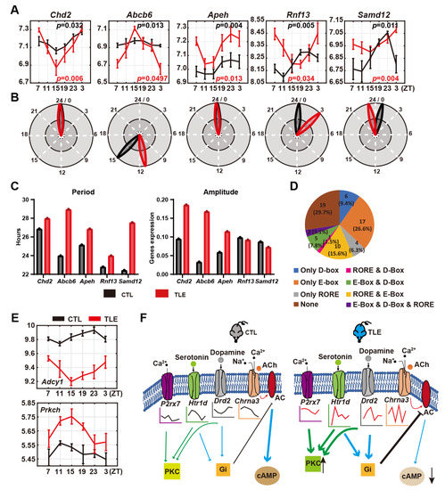 Analyses of five rhythmicity-maintaining epilepsy genes and circadian clock-regulated motifs in the promoters of rhythmically expressed epilepsy genes and the model for the altered cAMP signaling pathway in TLE mice. (A) Expression of five representative rhythmicity-maintaining genes Chd2 (Chromodomain helicase DNA binding protein 2), Abcb6 (ATP-binding cassette subfamily B member 6), Apeh (Acylaminoacyl-peptide hydrolase), Rnf13 (Ring finger protein 13), and Samd12 (Sterile alpha motif domain containing 12). (B,C) Altered phases (B), periods, and amplitudes (C) of five representative genes in WT and TLE mice. (D) Numbers of the epilepsy genes containing E-Box, D-Box, or RORE or their combinations in the 5′ 5000-bp promoter regions. (E) Expression of Adcy1 (Adenylate cyclase 1) and Prkch (Protein kinase C, eta type) in CTL and TLE mice. The black curve represents gene expression values from the CTL mice, and the red curve is for those in TLE mice. (F) A model for the altered cAMP signaling pathway in TLE mice.