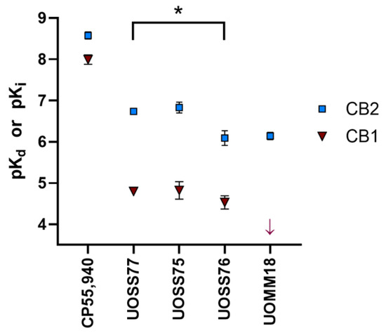 Binding affinities of compounds of interest at human CB2 or CB1 determined from radioligand competition binding assays (pKd for CP55,940, pKi for other compounds). Data are mean ± SEM from three to four independent experiments, except for UOSS75 at CB1 (n = 2). CB1 pKi values for all compounds, other than CP55,940, are estimates (see main text and Table 1). The arrow for UOMM18 in the CB1 set indicates no detectable binding to the lowest possible affinity constant measurable in our assay (pKi < 4). CB2 affinity was statistically compared between UOSS77 and its novel derivatives; * represents p < 0.05.
