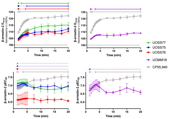 Similarly as for cAMP signalling, kinetic analysis of β-arrestin-2 recruitment signalling was also conducted. Figure 5 shows Emax and pEC50 during a 20 min stimulation for CP55,940 and the test compounds. Changes in Emax were evaluated based on comparison to the responses at 1.5 min, as all compounds had sufficient efficacy at this first-measured point to produce robust concentration response curves and subsequently changed gradually without an obvious “peak” time-point. The efficacy of CP55,940 increased rapidly after the initial measurement and reached a plateau after approximately 5 min of stimulation. The test compounds exhibited similar temporal trajectories, but efficacies were partial in comparison with CP55,940. The relatively small response magnitudes for UOSS75, UOSS76, and UOMM18 correlated with these taking slightly longer to produce an increase in efficacy relative to that measured at 1.5 min. Efficacy for all ligands was fairly stable from around 5 min of stimulation through to the end of the 20 min measurement period.