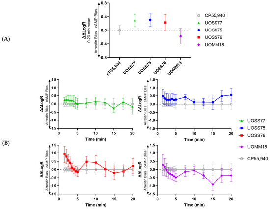 Signalling bias relative to CP55,940. Bias quantified as ΔΔLogR for cAMP signalling (positive; “cAMP Bias”) versus β-arrestin-2 translocation (negative; “Arrestin Bias”). (A) Bias for mean responses over a 20 min stimulation. (B) Bias at different time points throughout a 20 min stimulation. Data represents mean ± SEM from three to four independent experiments for each pathway.