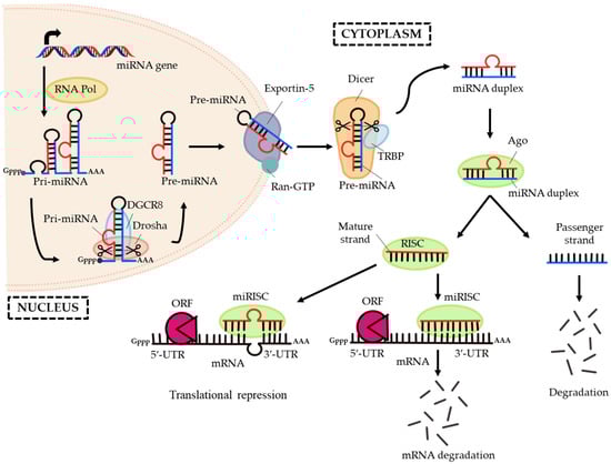 In mammals, the first step of miRNA biosynthesis begins with the transcription of miRNA genes in the nucleus by RNA Polymerase II or III to generate the primary transcripts (pri-miRNAs) [,,,]. The pri-miRNAs which are several kilobases in length with local stem-loop structures, 5′-cap and poly(A) tail [] are then processed into the precursor miRNAs (pre-miRNAs) by the microprocessor complex, composed of an RNA binding protein DiGeorge Syndrome Critical Region 8 (DGCR8) and Drosha (a ribonuclease III enzyme) [,,,,]. The pre-miRNAs formed are 70- to 80-nucleotides long hairpin-shaped structure, with a 5′-phosphate and two-nucleotides 3′-overhang []. Next, the pre-miRNAs are exported from the nucleus into the cytoplasm by exportin-5 (XPO5) that belongs to the RanGTP-dependent nuclear transport reporter family [,,,].