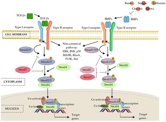 Canonical signalling is initiated upon the binding of TGF-β or BMP ligands to a heterotetrametric receptor complex in the cell membrane [,,]. This heterotetrametric receptor complex is composed of type I and II serine/threonine kinase receptor [,,]. Upon binding of ligands, the type II receptor will trans-phosphorylate the corresponding type I receptor, which then recruits and phosphorylates their specific receptor-Smads (R-Smads) [,,]. The phosphorylated R-Smads associate with the common-partner Smad (Co-Smad) to form a heterocomplex. Consequently, the R-Smad/Co-Smad complex translocates into the nucleus, where it binds to promoters of target genes and governs their transcription, in cooperation with other DNA-binding transcription factors, co-factors, co-repressors, and chromatin remodelling factors [,,]. In addition, TGF-β/BMP signalling can also be regulated by multiple Smad-independent signalling pathways, including extracellular signal-regulated kinase (ERK), c-Jun N-terminal kinase (JNK), p38 mitogen-activated protein kinases (p38 MAPK), Ras homolog family member A (RhoA), phosphatidylinositol 3-kinase (PI3K), and protein kinase B (Akt) in a cell-context-dependent manner [].