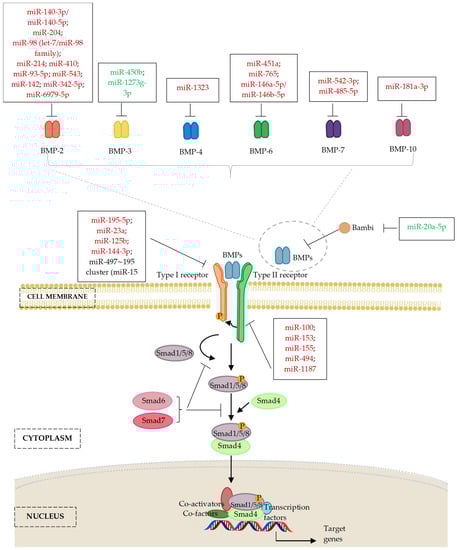 MicroRNAs with regulatory effects on components of bone morphogenic protein (BMP) signalling. Notes: MicroRNAs in green indicate positive regulation on osteogenesis, and microRNAs in red indicate negative regulation on osteogenesis, while microRNAs in black text indicate both positive and negative effects on osteogenesis.