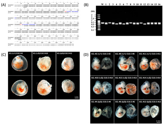 In contrast to the conventional gene knockout method in which an antibiotic resistant gene cassette was usually used to interrupt a target gene by homologous recombination, the gene editing by the CRISPR/Cas9 system is mediated by the cut and nonhomologous-end-joining mechanism [26]. It is efficient for eradicating a DNA fragment from the genome simply by using a pair of single-guide RNAs and Cas9 [24,27]. According to the same strategy, a 118 bp DNA fragment in exon IV of the mouse SCL gene was deleted to create an out of frame mutation (Figure 1A). Because of the deletion, genotyping could be simply performed by agarose gel electrophoresis (Figure 1B). The heterozygote of the deletion mutants (SCL+/Δ) grew normally like the wild type; however, the homozygous fetuses (SCLΔ/Δ) could be found by E11.5. The heritable probability of this deletion mutation followed Mendel’s laws up to E10.5.